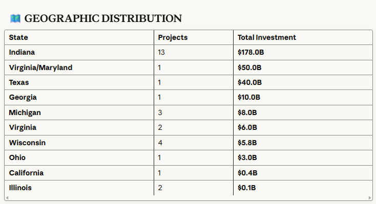 - Indiana: Massive concentration ($178B across 13 projects) – likely includes Amazon’s New Carlisle megaproject